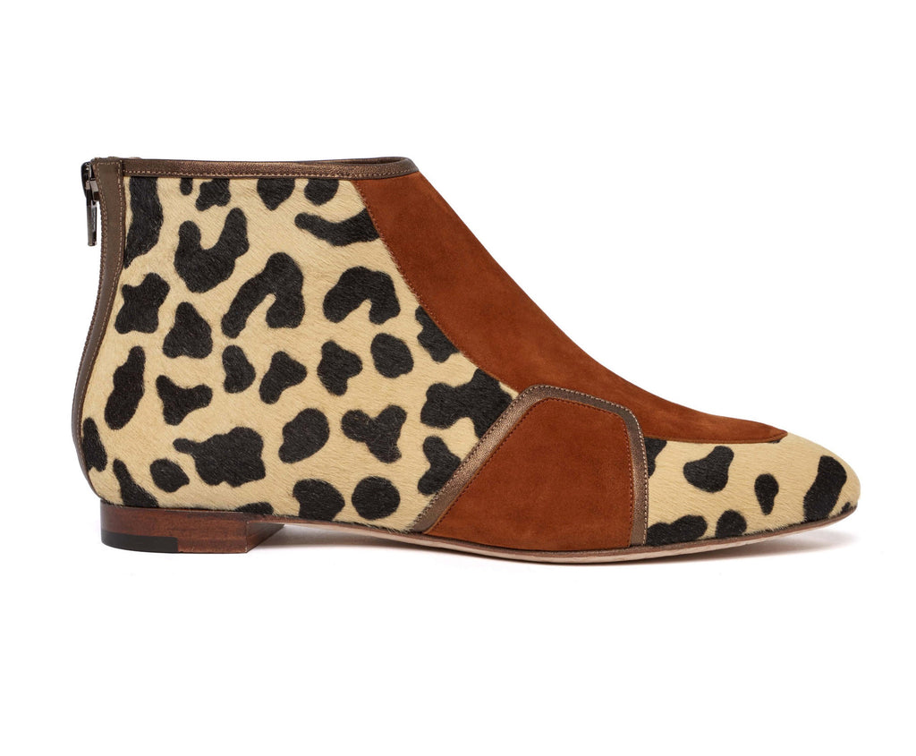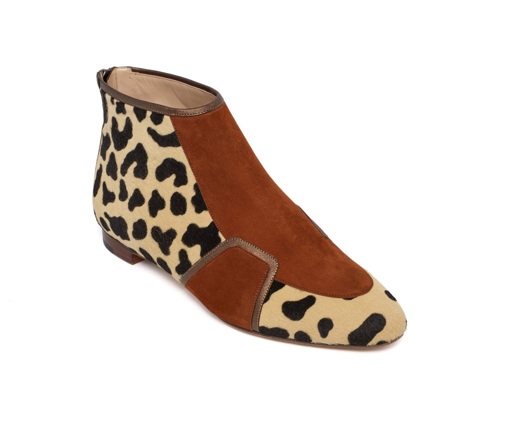 Richly detailed black and tan leopard-print hair calf ankle boot.